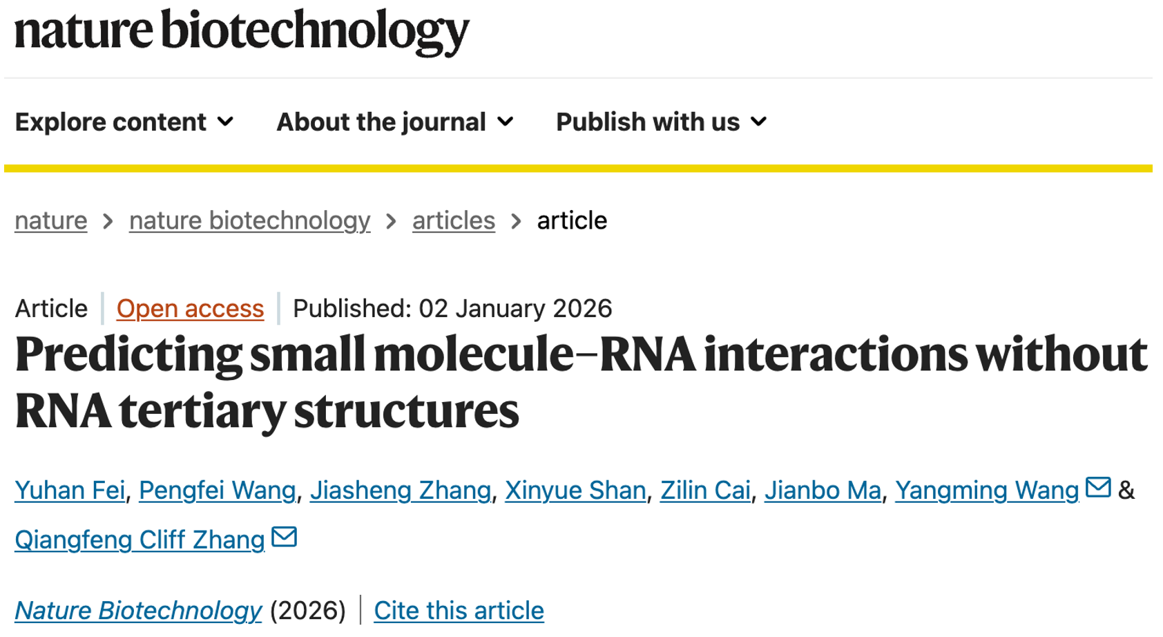 On January 2, a team led by Qiangfeng Cliff Zhang at Tsinghua University and Yangming Wang at Peking University reported a study entitled Predicting small molecule–RNA interactions without RNA tertiary structures in Nature Biotechnology. In this collaboration, the authors developed an artificial intelligence (AI) method termed SMRTnet, which enables accurate prediction of small molecule–RNA interactions and their potential binding sites using only RNA secondary structure information. Through systematic computational analyses combined with experimental validation, the study comprehensively demonstrated the superior performance of SMRTnet in drug screening, providing a novel AI method for RNA therapeutics discovery.