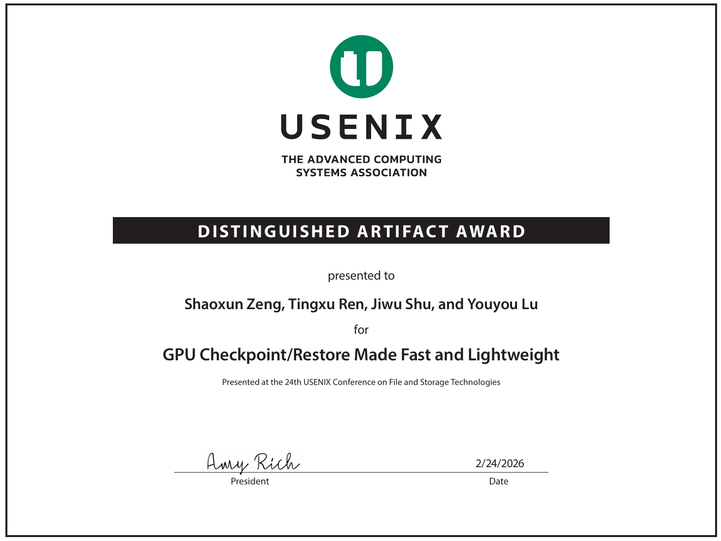 Tsinghua University's Storage Research Group from the Department of Computer Science and Technology has been honored with the Distinguished Artifact Award at the 24th USENIX Conference on File and Storage Technologies (FAST 2026). The accolade recognizes their pioneering paper, "GPU Checkpoint/Restore Made Fast and Lightweight," which introduces a novel scheme to enhance GPU efficiency in modern computing environments.