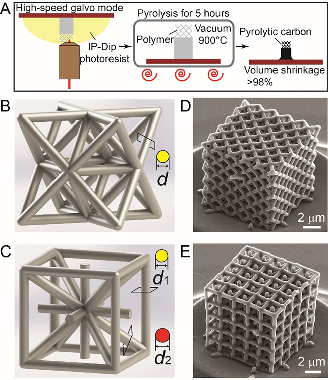 Figure 1. Fabrication and microstructures of pyrolytic carbon nanolattices
