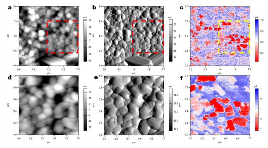 Fig.1 c-AFM images of perovskite thin films measured in dark and under illumination