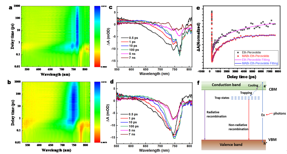 Fig.2 Femtosecond transient absorption spectra of perovskite thin films and possible exciton capture and recombination processes