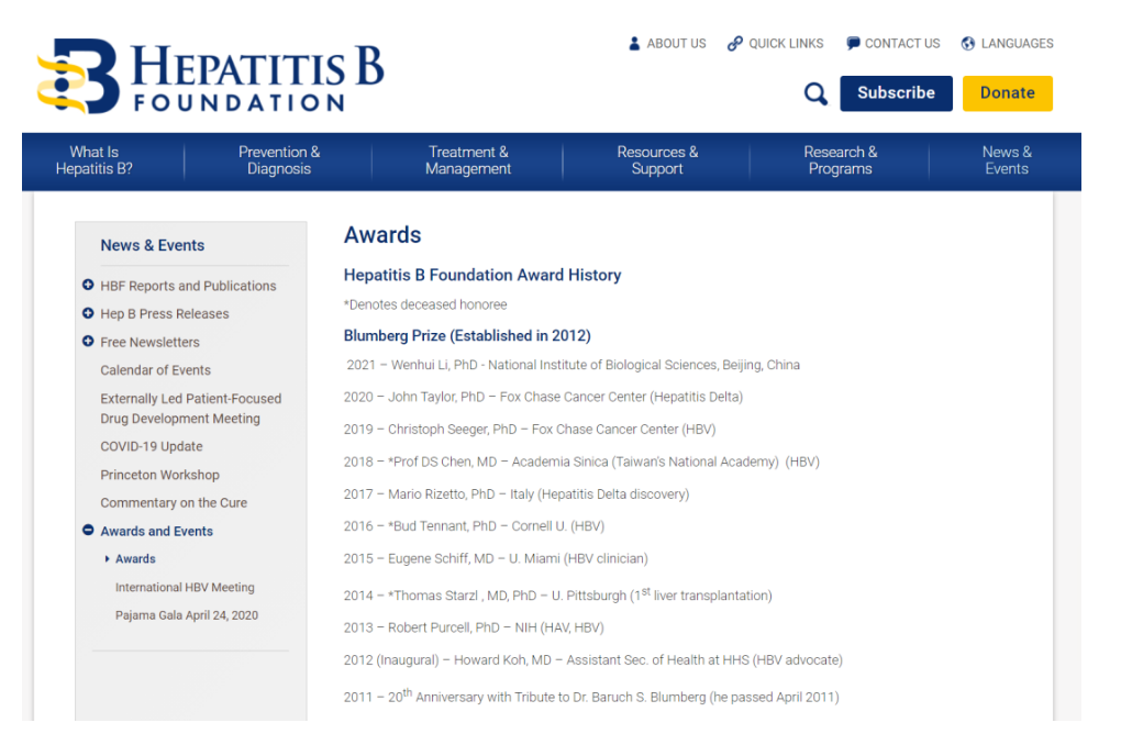Issued by the Hepatitis B Foundation, the Baruch S. Blumberg Prize is named after Baruch S. Blumberg, who received the Nobel Prize in Medicine and Physiology in 1976 for discovering the hepatitis B virus (HBV), and is considered as the “Nobel Prize for HBV research". Its previous honorees include Thomas Starzl, the 2012 Lasker Award for Clinical Science recipient, and Harvey J. Alter, the 2020 Nobel Laureate in Physiology and Medicine.