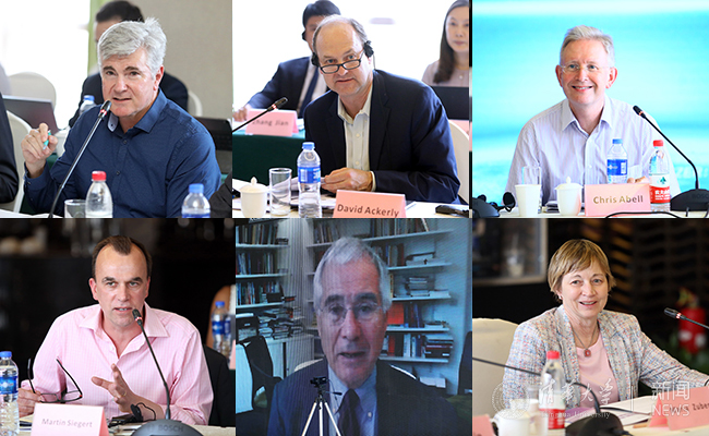 来自各所大学的代表畅所欲言。(从上到下、从左到右)分别为:澳大利亚国立大学气候变化研究院院长Mark Howden,加州伯克利大学自然资源学院院长David Ackerly,剑桥大学副校长Chris Abell,帝国理工大学地理科学教授、格兰瑟姆研究所联合主任Martin Siegert,伦敦政治经济学院格兰瑟姆研究所主席、政治经济学教授Nicholas Stern(连线现场),麻省理工学院副校长Maria Zuber。