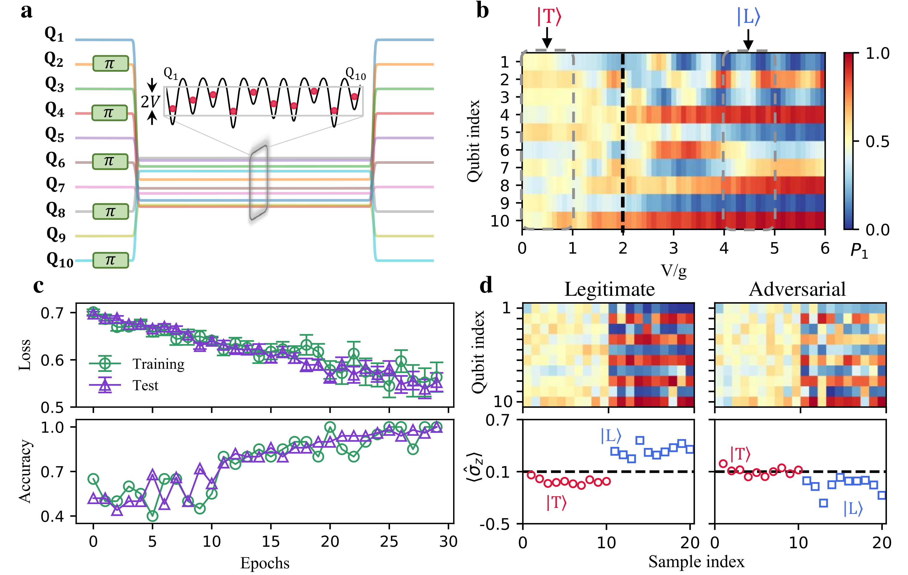 在量子机器学习领域,近年来的理论工作展示了在某些特定的任务下,量子分类模型和生成模型相对于经典模型具有可证明的、有复杂性理论保证的优势。最近两年,量子对抗机器学习的概念也被提出并受到了广泛关注。然而,在当前中等规模带噪声(NISQ)量子设备上演示量子学习模型面对对抗攻击的脆弱性和防御手段还面临诸多挑战。该研究中,2025新澳门开门原料免费交叉信息研究院邓东灵团队设计了处理经典数据和量子多体态数据的学习模型,并与浙江大学超导量子计算团队合作,首次在量子设备上成功实现了高维数据的学习、对抗攻击脆弱性的揭示以及相应防御手段的展示。