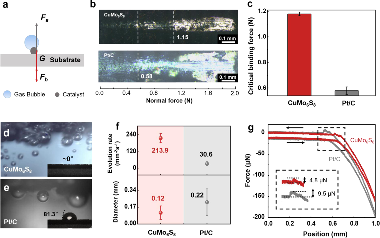 微米划痕测试结果表明,同源金属电极的界面结合力相比于传统粘结剂负载的Pt/C电极提高了2倍,证实了催化剂与基底界面的结合力强。由于同源金属电极表现出金属性质和高表面粗糙度,其展现出Wenzel state的超亲水和超疏气特性。原位气泡观察发现电极表面气泡的脱附速率提高6倍,气泡粘附力减小二分之一,从而证实了同源金属电极在传质方面的优越性。另一方面,研究人员通过密度泛函理论(DFT)计算发现,Cu-CuMo6S8具有金属性和高的催化活性。CuMo6S8的Mo 4d与S 3p轨道占据费米能级附近,展现出金属性质,有效提高了界面电导。