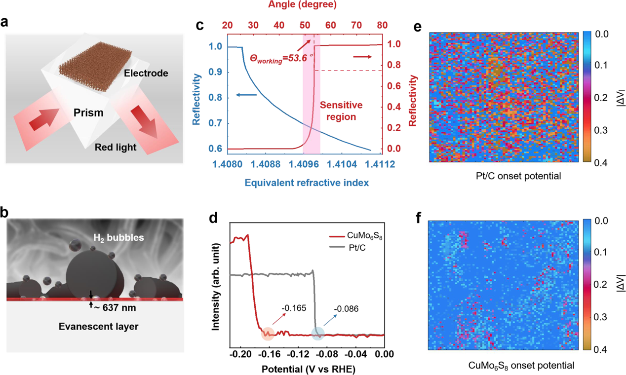 研究人员引入了原位全反射成像技术来观测电极表面活性的变化情况。此技术基于电极与三棱镜界面处氢气微纳气泡对反射光强的影响,利用全反射状态下光强突变所对应的起始电位表示催化剂的活性,而反应前后二者的起始电位差值就能体现出催化剂活性的变化情况。该技术不仅能够将电化学与光学手段结合,准确地实现电极表面活性成像,同时有望在未来实现电极活性的高通量筛选。