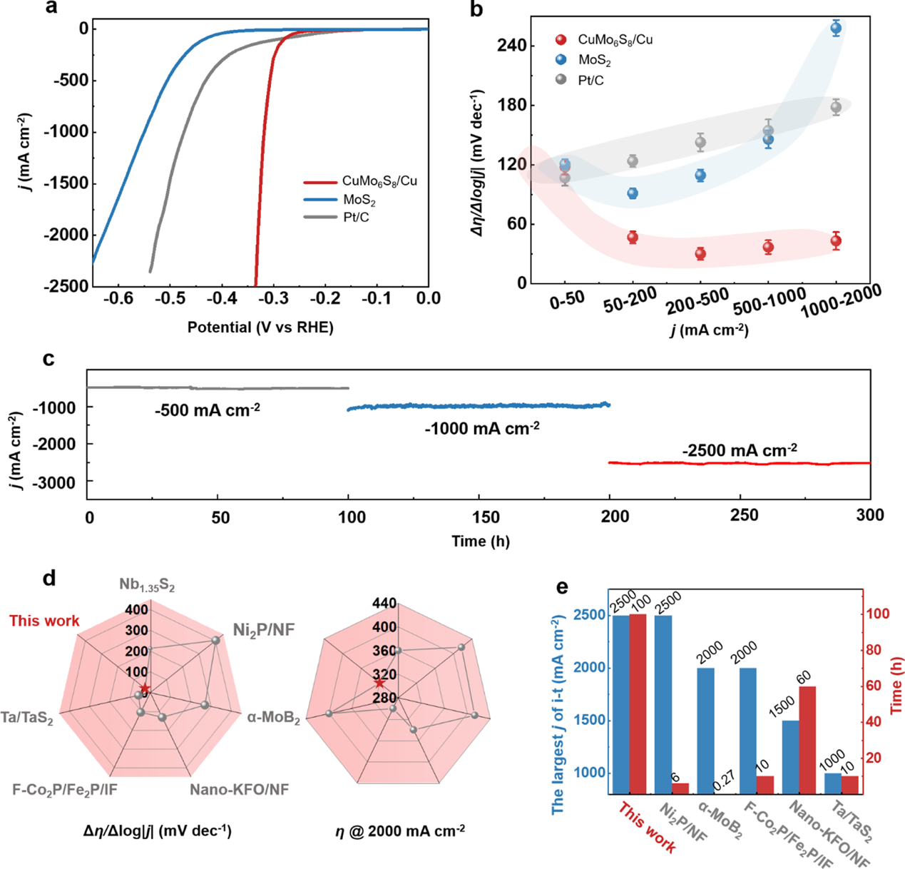 图2.大电流密度下Cu-CuMo6S8电极的析氢性能