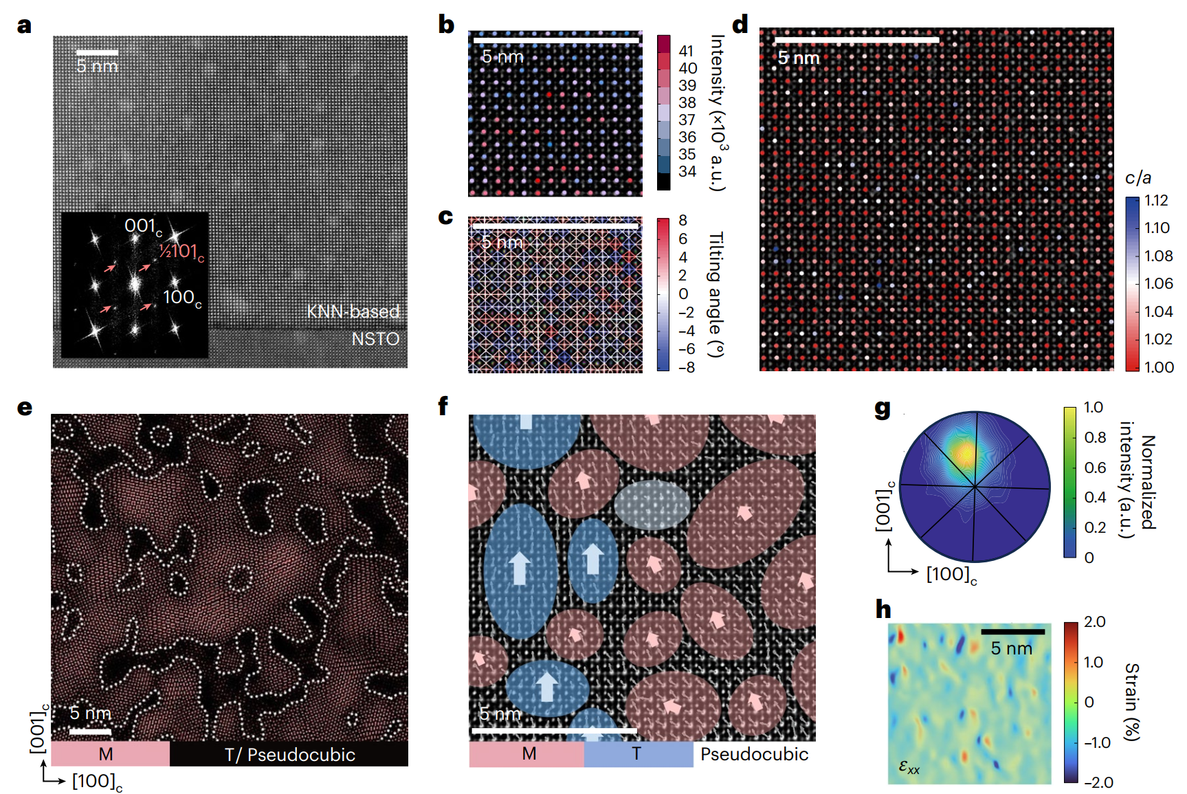 为深入理解性能提升的物理机制,研究团队利用积分差分相位衬度扫描透射电子显微镜技术直接观测到了薄膜中相互交织的单斜与四方极性纳米区域。这种极性纳米微区使压电性能倍增,且极化矢量翻转具有对外电场高频信号的快速响应,促进了宽频域内的极化动力学,从而稳定地增强了较大高频范围内的应变响应。同时,由多元掺杂和两步结晶法协同促进的微区异质性更好地实现了相界弥散,使M+T双相结构在更宽温度范围内实现了稳定共存,显著改善了KNN基薄膜电致应变的温度稳定性。