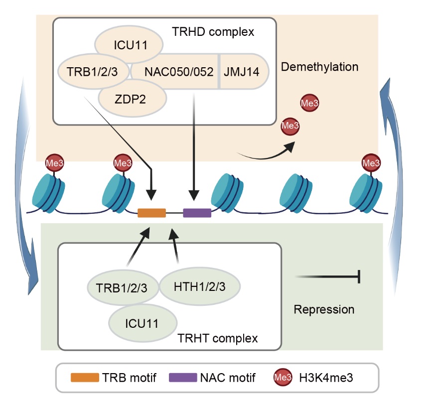 综上,研究发现TRB家族蛋白所形成的两种新型蛋白复合体,阐明了它们与PEAT、PRC2复合体协同作用模式,揭示了植物对多种染色质修饰的协同调控机制,为理解植物复杂性状的表观遗传调控提供了全新视角。