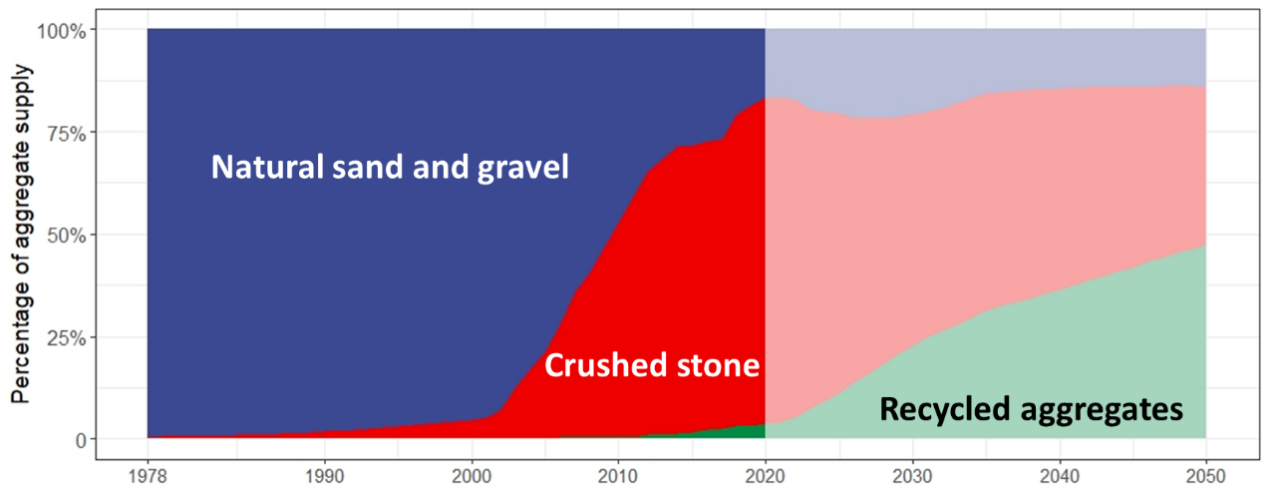 图1.1978-2050年中国砂石资源供给侧分布(1978-2020为历史数据,2021-2050为全部循环经济举措情景下模型测算数据)