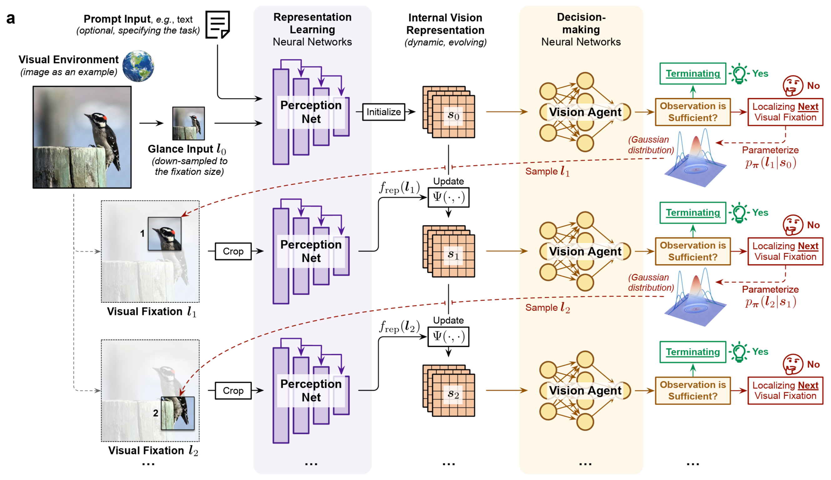 AdaptiveNN模型在一个视觉环境中,依次在若干感兴趣区域上进行“注视”,逐步积累信息形成内部视觉表征,并动态决定何时结束该过程。在每一步,Vision Agent基于当前的内部视觉表征评估任务完成度,若信息不足,则通过策略网络选择下一次注视位置。每个选定的注视区域由表征提取网络提取深度特征,从而不断更新内部视觉表征用于后续决策。AdaptiveNN的整体框架模拟了人类从全局到局部、从粗到细的视觉感知策略,使神经网络具备了类人式的主动感知能力,突破了传统视觉模型的效率瓶颈。