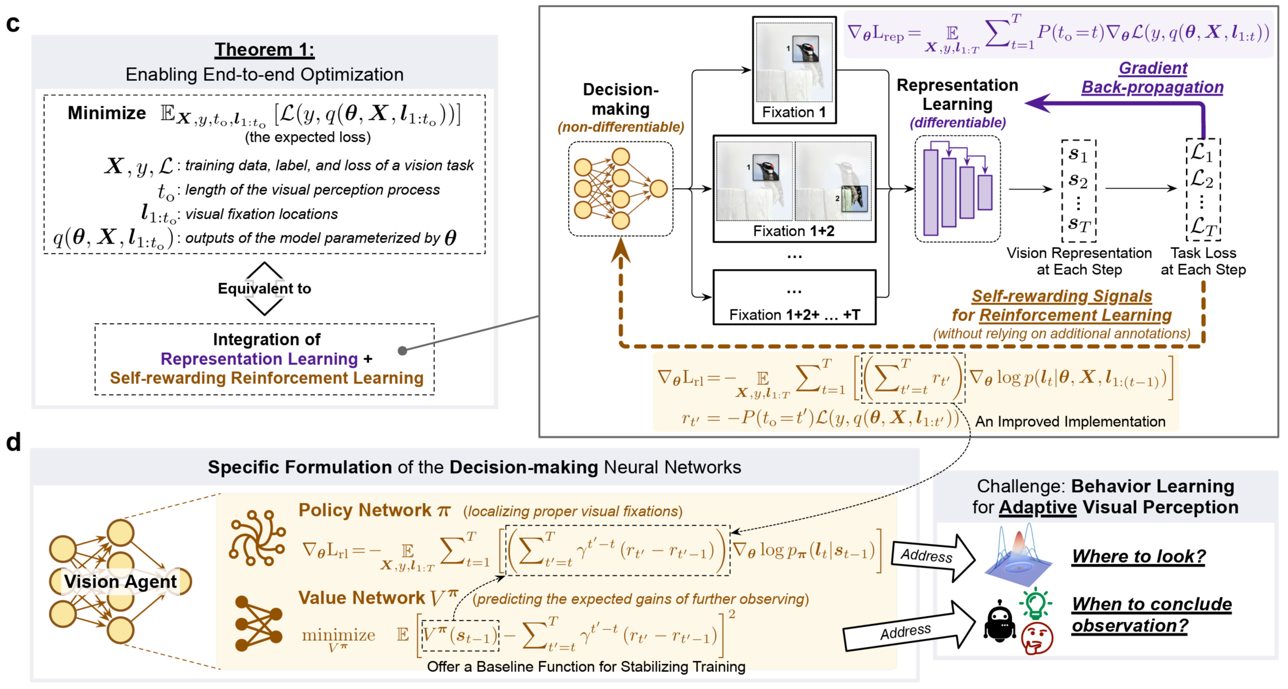 AdaptiveNN的训练过程同时涉及连续变量(如从注视区域中提取特征)和离散变量(如决定下一次注视位置)的优化。具体而言,从期望优化目标出发,对整体损失函数进行分解,AdaptiveNN的端到端优化过程可自然地分解为两项:第一项为表征学习目标(representation learning),对应于从注视区域中提取任务相关的特征;第二项为自激励强化学习目标(self-rewarding reinforcement learning),对应于优化注视位置的分布,驱使模型的主动注视行为实现最大化的任务收益。这一理论结果揭示了AdaptiveNN的内在学习规律:主动感知的优化本质上是表征学习与强化学习的统一。