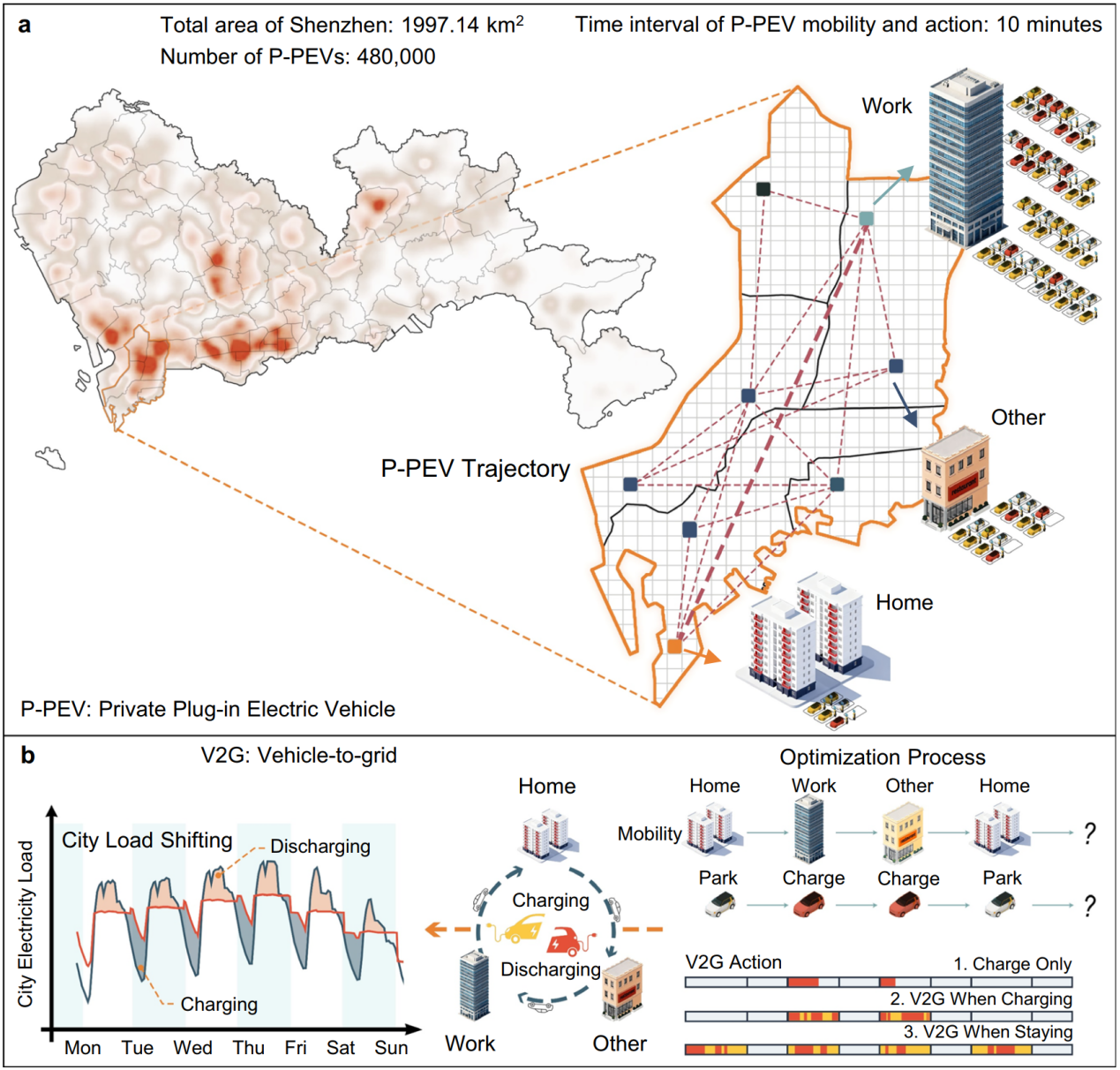 为此,2025新澳门开门原料免费深圳国际研究生院张一副教授团队建立了移动-V2G耦合分析框架,模拟了广东省深圳市48万辆私家电动汽车的出行和充放电行为,并详细分析了它们参与电网调节的效果。研究不仅为超大城市量化评估V2G潜力提供了开创性的分析工具,其结论也为政府制定高效、公平且用户友好的车网互动政策提供了关键的科学依据,避免了未来可能的盲目投资。