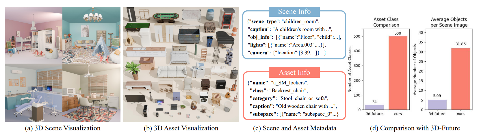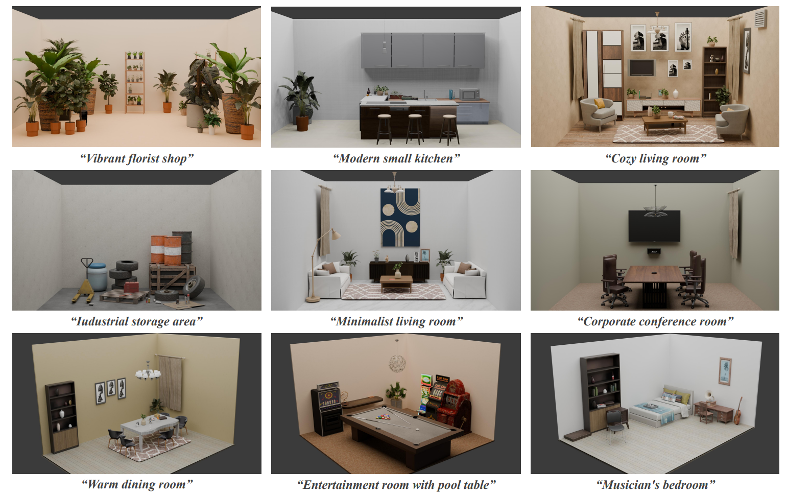 清华新闻网12月11日电 随着具身机器人的场景泛化需求和数字内容创作需求,根据自然语言的场景描述,从预定义的资产集合中生成逻辑连贯且丰富的自定义3D场景布局(文本-3D场景生成)成为一项具有挑战性的任务。传统方法定义精确的规则既耗时又需要大量的艺术专业知识,并且限制了复杂和多样场景组合的表达。基于深度学习的方法,当前数据集仍然相对有限,生成结果缺乏多样性,无法完全满足艺术专家的实际需求。近期基于大语言模型的场景生成方法虽然通过语言模型提取布局先验,但在空间感知和几何精度上仍有不足,难以准确表示复杂的空间关系、建模对象姿态,并符合美学设计原则。