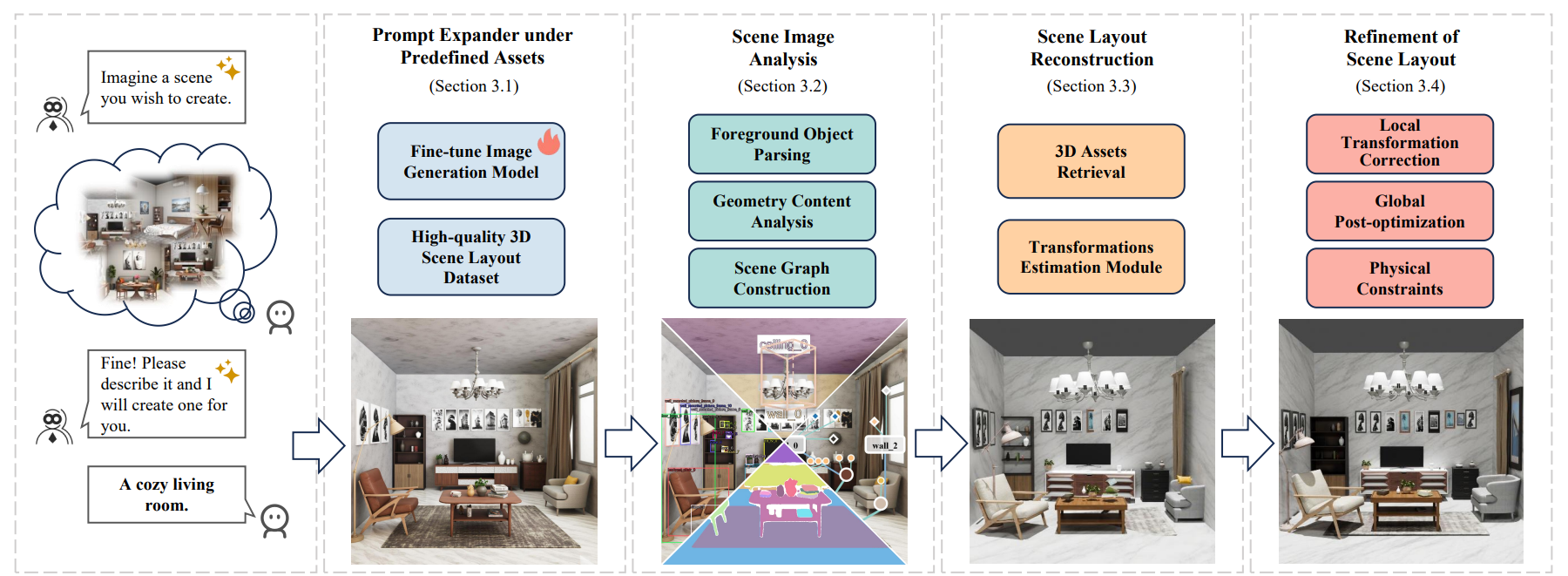 研究团队使用图像生成模型Flux将用户的输入提示扩展为引导图像,通过高质量3D场景布局数据进行微调,Flux能够生成质量更高且与资产集合风格更一致的图像,这显著提高了摆放系统的可控性;接着构建一个基于预训练视觉模型的图像分析模块,融合视觉语义分割、单图像几何解析以及基于图的场景图逻辑构建功能;随后根据语义特征匹配策略,从资产集合中检索出与引导图像最匹配的对象,结合视觉语义特征、几何信息和场景布局逻辑,迭代计算每个前景对象的旋转、平移和缩放变换。最终,团队通过场景图逻辑和图像语义解析对三维场景布局进行一致性优化,确保最终3D场景在视觉和逻辑上与引导图像相近。