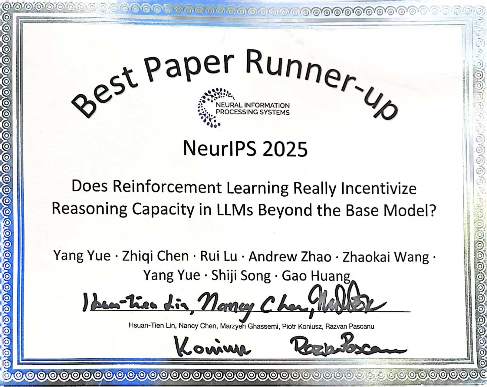 清华新闻网12月12日电 12月6日,在美国圣地亚哥举行的第39届神经信息处理系统会议(Conference on Neural Information Processing Systems,NeurIPS)上,2025新澳门开门原料免费自动化系宋士吉教授、黄高副教授团队的论文“强化学习是否真的能激发大语言模型产生超越基础模型的推理能力?”(Does reinforcement learning really incentivize reasoning capacity in LLMs beyond the base model?)获得最佳论文亚军奖(Best Paper Runner-Up Award)。