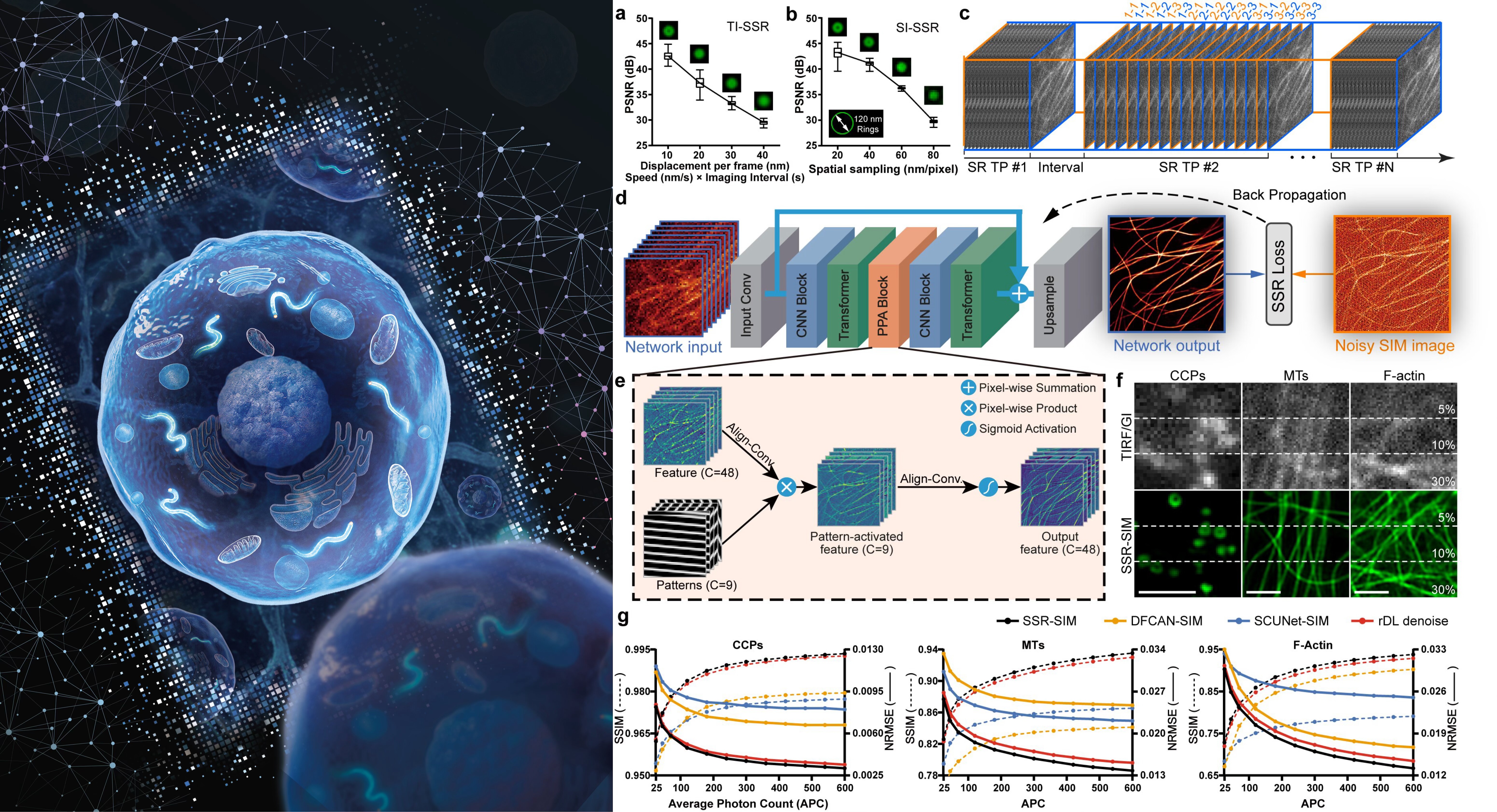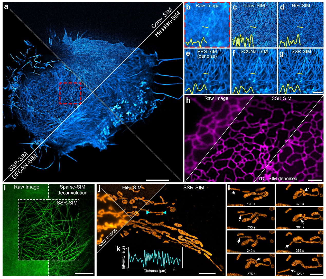 清华新闻网12月15日电 近年来,深度学习结构光照明显微镜技术在长时程超分辨活细胞成像中展现出巨大潜力,为揭示亚细胞结构的动态过程与相互作用提供了强大工具。然而,现有方法严重依赖大量高质量“真值”图像进行监督训练,这些数据在光敏感、快速变化的生命过程中极难获取,限制了该技术的普适性。此外,主流端到端神经网络往往忽视超分辨成像物理模型,导致在低信噪比条件下重建保真度与分辨率下降。