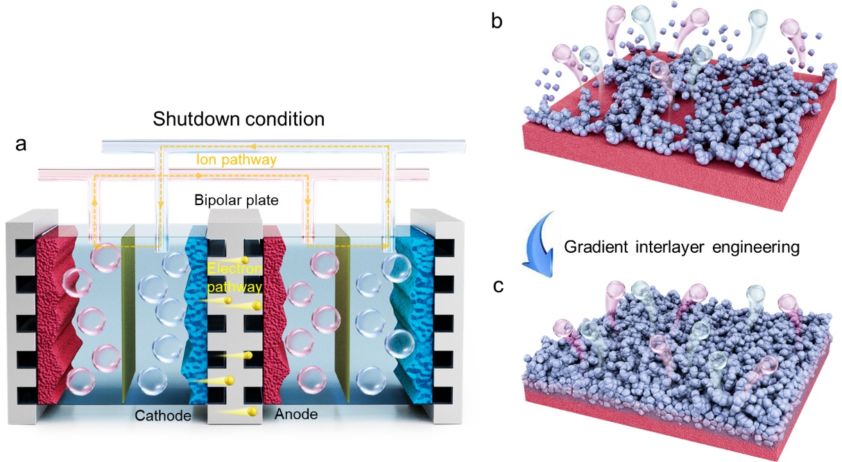图1.(a)碱性电解槽停机后“反向电流”产生机制;(b)停机期间催化层脱落和电极腐蚀示意图;(c)“梯度异质界面工程”策略和电极稳定性提高示意图
