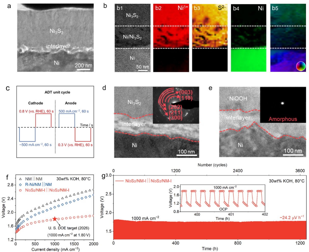 区别于传统的材料组成与电子结构优化,研究团队转向对界面晶体学结构的精密调控。通过热注入工艺在商业镍网基底上原位生长出具有Ni/Ni3S2梯度异质界面过渡层的Ni3S2催化层。该结构通过“无缝界面”有效缓解了异质材料间的晶格失配和应力,促进了电荷再分配,从根本上增强了界面在剧烈电位反转和高电流密度下的机械与电化学稳定性。在80°C、30 wt% KOH的工业测试条件下,该电极不仅达到美国能源部2026年碱性电解的活性目标(1000 mA cm−2@1.79 V),更实现了3600次启停循环的严苛工况下性能零衰减,展现出工业应用的巨大潜力。