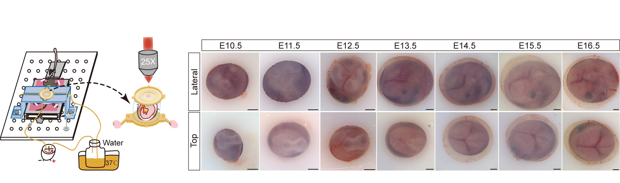 研究开发的IMEE活体成像技术,通过辅助支持装置固定胚胎小鼠并结合双光子显微成像,实现了对E10.5至E16.5胚胎小鼠的长时程、大视野、高深度活体观测。研究人员通过监测胚胎脑内血流,检查胚胎形态,评估胚胎脑组织细胞活性、组成及细胞功能等多方面指标,证实了IMEE成像过程中胚胎小鼠发育状态正常。