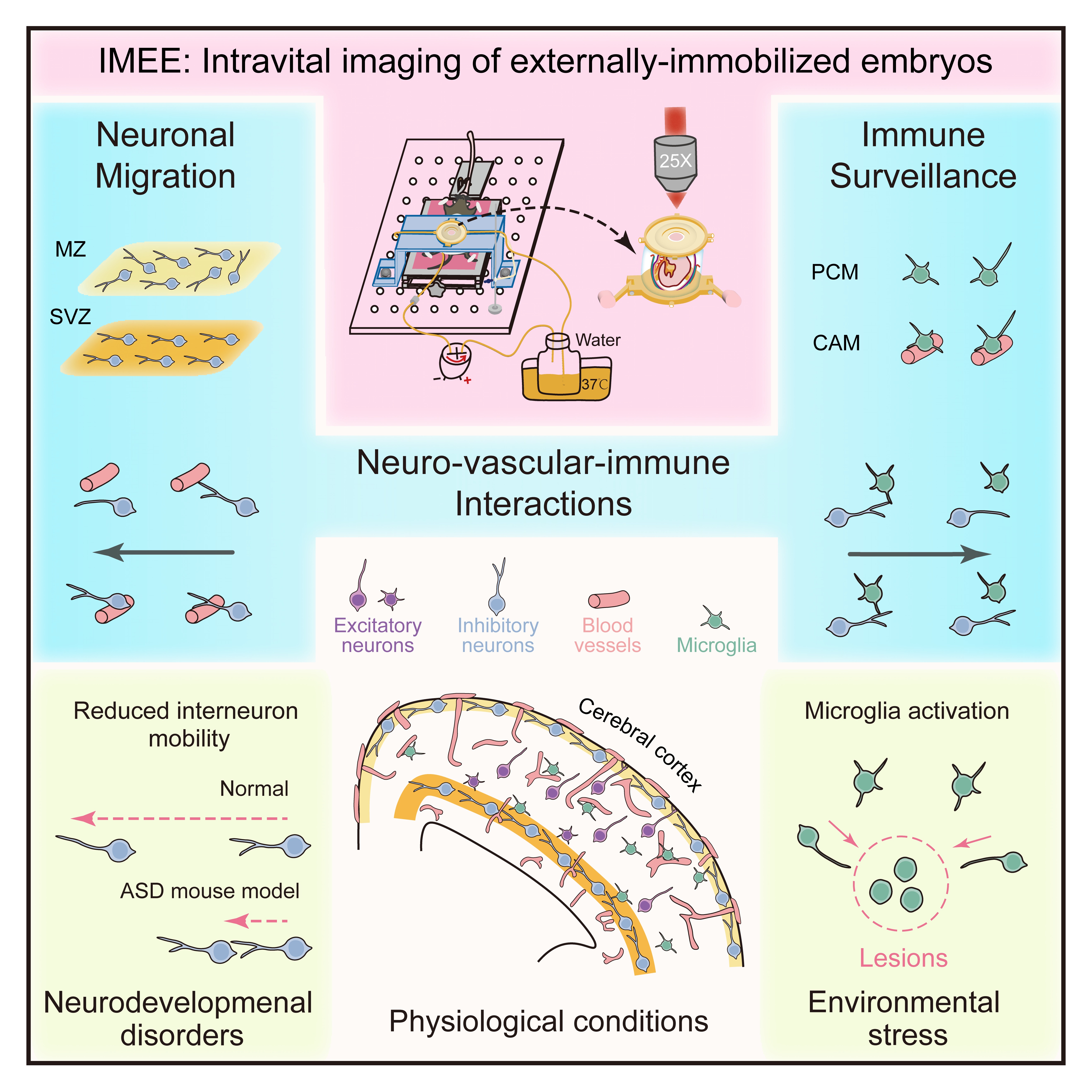 研究开发了一种高稳定性、多视角、长时程的胚胎小鼠宫内活体成像技术(IMEE),首次在体阐明了胚胎小鼠大脑皮层内抑制性神经元与血管网络及小胶质细胞间的动态互作模式。研究还为神经发育性疾病模型小鼠中神经元迁移异常提供了全新在体证据,同时解析了胚胎免疫细胞在响应环境压力时的动态行为模式。该工作突破了传统胚胎神经成像的技术瓶颈,为解析大脑发育过程中的神经-血管-免疫系统互作机制与协同发育机制开辟了全新的研究范式,凸显了胚胎活体成像技术在神经科学与脑疾病研究中的重要价值。