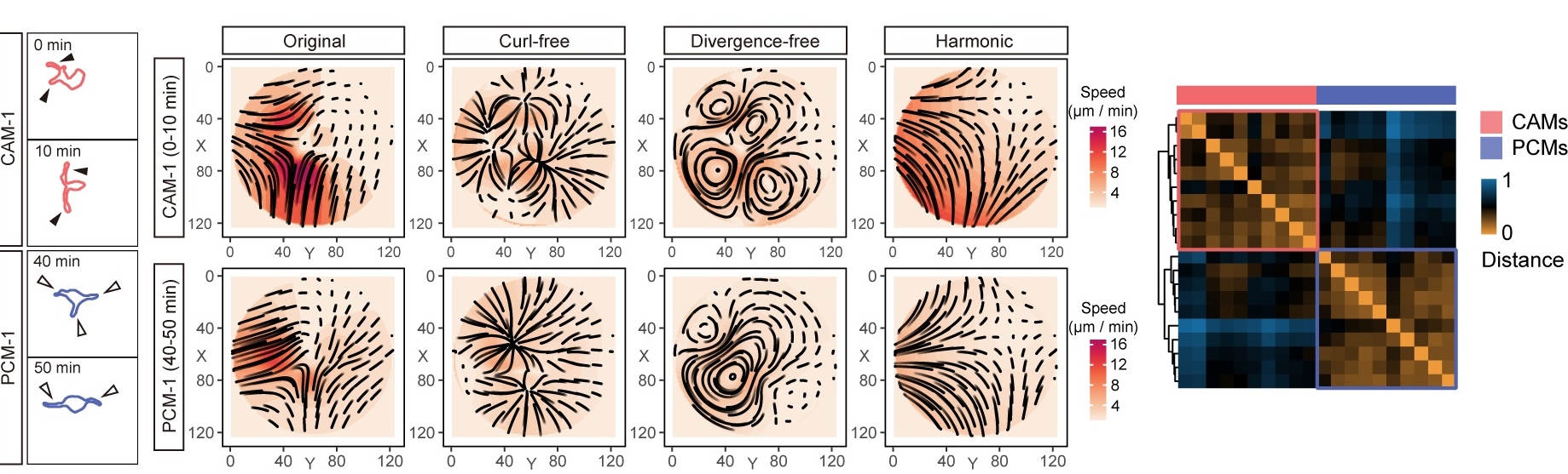 此外,借助IMEE技术,研究团队对Cx3cr1GFP+/-转基因胚胎小鼠大脑皮层中内源荧光标记的小胶质细胞进行了实时观测,并结合细胞形态变化构建向量场,进行了拓扑分解分析。结果显示,静息状态下的毛细血管相关小胶质细胞(Capillary-associated microglia, CAMs)与脑实质小胶质细胞(Parenchymal microglia, PCMs)在环境监视中表现出不同的动态行为模式,其中后者显示出更活跃的细胞突起伸缩运动。