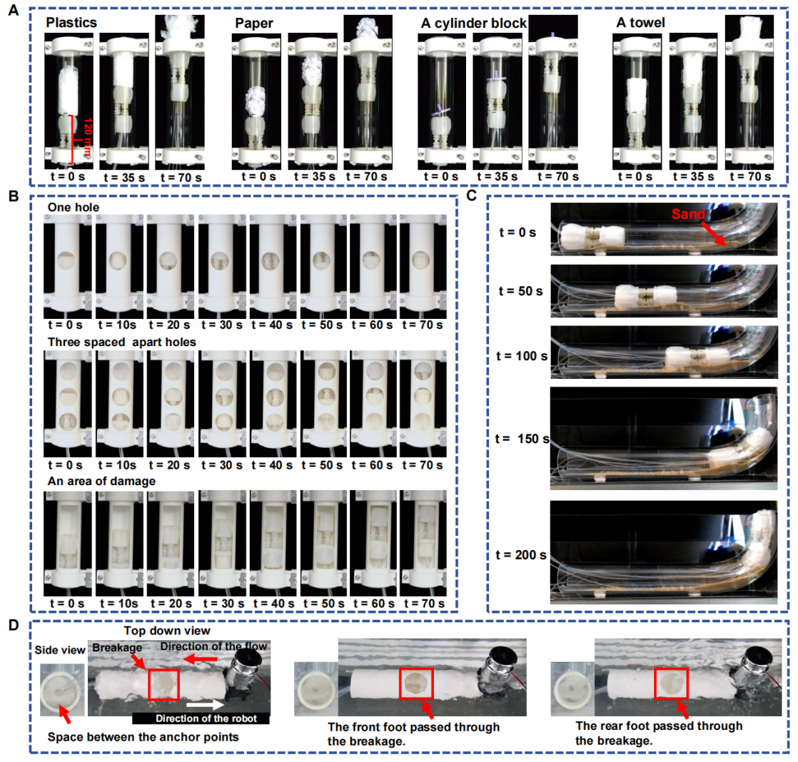 管道作为能源运输与城市运维的核心基础设施,其隐蔽性、复杂性给检测维护带来巨大挑战。传统刚性管道机器人结构复杂、控制难度大,在小管径、破损管道或动态水流等复杂工况下适应性受限;现有软体机器人虽具备灵活性优势,但普遍存在流阻大、负载能力弱、难以应对真实管道故障等问题。