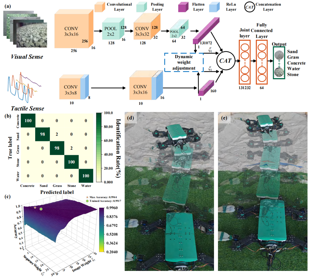 面对以上挑战,曲钧天团队从海龟的运动中汲取灵感,研制出一款智能仿生两栖海龟机器人,该机器人采用三自由度仿生鳍肢与轻量化设计,并通过贝叶斯优化实现低功耗高效运动。其核心创新在于融合视觉与触觉信息,利用双流卷积神经网络进行地形实时分类,准确率高达99.17%,并据此实现动态步态自适应。该策略使机器人能效提升19.1%,运动速度提高9.2%,在复杂环境中表现出卓越的稳定性。