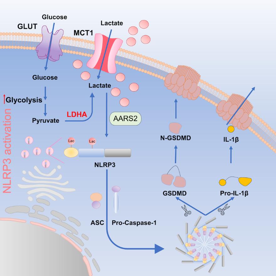 研究成果以“有氧糖酵解通过NLRP3的乳酸化促进NLRP3炎症小体的激活”(Aerobic glycolysis promotes NLRP3 inflammasome activation via NLRP3 lactylation)为题,于2月4日发表于《细胞化学生物学》(Cell Chemical Biology)。