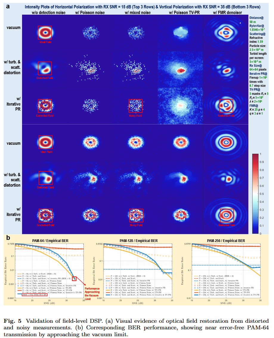 为验证这一理论框架的有效性,研究团队设计了基于光场级信号处理(DSP)的64阶脉冲幅度矢量调制系统。实验结果显示,在湍流、散射与含噪接收条件下,该方案能有效利用光场并发度作为抗干扰特征,显著降低误码率,提升了无线光通信中“光管填充(Filling the light pipe)”的通信容量。
