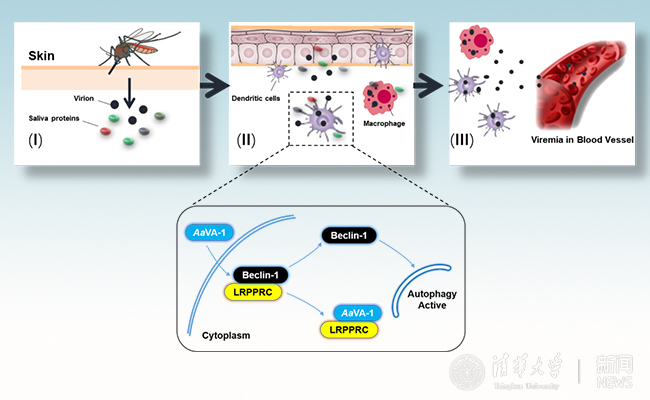 之前研究结果显示,激活宿主细胞自噬反应可以有效辅助登革及寨卡病毒感染。课题组的机制研究显示,AaVA-1蛋白能够与自噬抑制因子LRPPRC蛋白结合。正常条件下,LRPPRC通过结合Beclin-1蛋白抑制细胞自噬的发生;而AaVA-1蛋白能够竞争结合LRPPRC蛋白,释放Beclin-1,激活自噬反应(图2)。该研究揭示了宿主、媒介蚊虫和病毒之间的互作关系,阐明了蚊虫通过唾液增效因子影响蚊媒病毒传播的分子机制,为重要蚊媒病毒防控提供了新的干预靶点及思路。