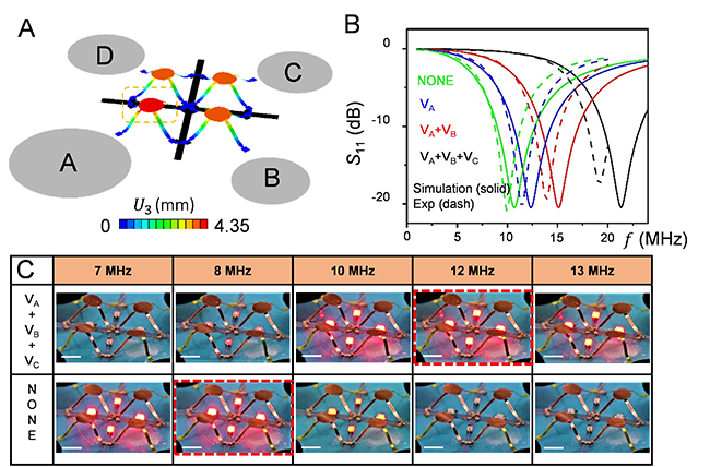 图3:A图为可重构电容器件的有限元仿真图,U3代表离面位移。B图为该可重构LC电路在四种状态下入射信号的回波损耗曲线(S11)。C图为利用该LC电路实现的亮度可调的LED演示实验。