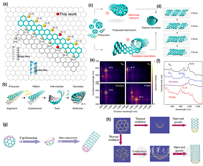 鉴于魏飞教授团队在水平阵列状碳纳米管研究领域取得的突出成就,《化学会评论》期刊编辑邀请魏飞教授在水平阵列状碳纳米管研究方面撰写综述论文。这是魏飞教授团队继今年初在美国化学会旗下的《化学研究评述》(Accounts of Chemical Research)发表封面综述论文之后,再次受邀在知名国际综述期刊上发表碳纳米管研究综述论文。该论文系统阐述了水平阵列状碳纳米管的生长机理、结构控制方法(图2)、形貌调控策略、结构表征、优异性能及应用,对于水平阵列状碳纳米管未来研究和应用具有重要的指导意义。