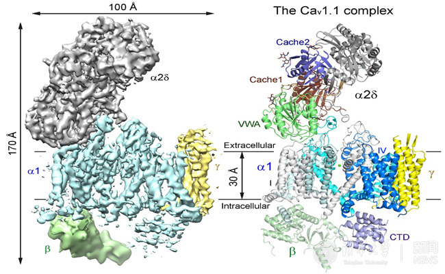 Cav1.1的电镜密度图(左)和整体结构模型(右)。