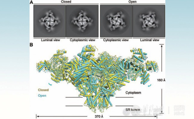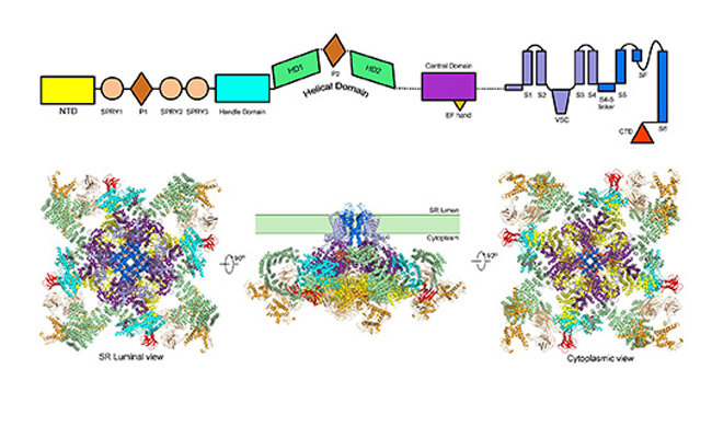 兴奋收缩偶联是调控骨骼肌和心肌正常收缩功能的重要基础生理过程。该过程主要由两个重要的钙离子通道参与,分别是位于细胞膜上的电压门控钙离子通道Cav 和位于肌质网膜上的利阿诺定受体(Ryanodine receptor,RyR)。电压门控钙离子通道能够感受细胞膜电势变化,将信号传递给下游的利阿诺定受体,促使钙离子释放进入细胞质,进而引起肌肉的收缩。钙离子通道的功能异常会导致心率紊乱、癫痫等疾病,而利阿诺定受体的紊乱会导致肌中央轴空病等疾病。因此它们是重要的药物靶点,其结构解析工作具有重要的生理学和药理学意义。