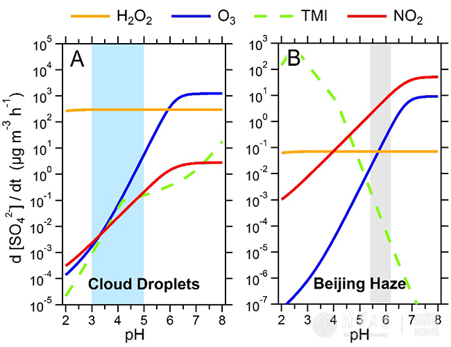图1:典型云水情景(左图)与北京重灰霾情景(右图)下硫酸盐不同生成机制的相对重要性对比。蓝色、灰色阴影分别代不同情景下的典型pH值范围。