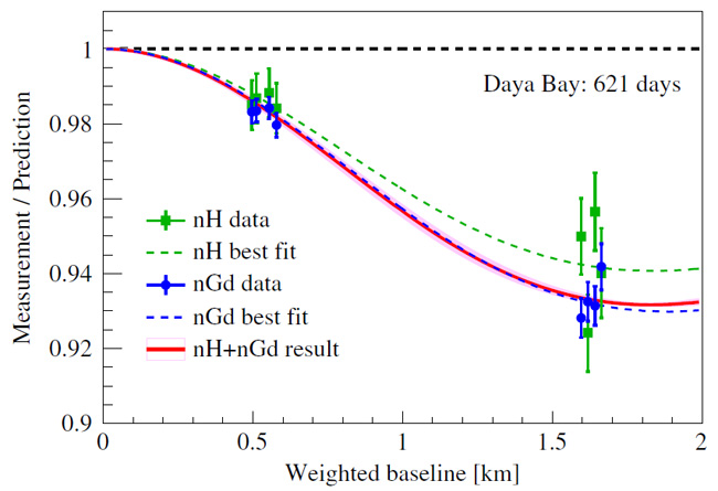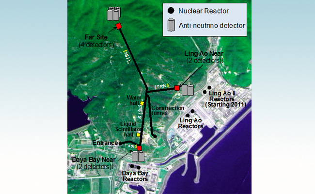 大亚湾反应堆中微子实验位于深圳大亚湾核电站内,于2011年8月开始运行取数。整个实验建有两个近点、一个远点,3个实验大厅,远近点联合分析极大地消除θ13测量中的系统误差。大亚湾实验利用反应堆释放的电子型反中微子与探测器靶物质中质子的反贝塔衰变探测中微子信号。来自于此反应的瞬时的正电子信号和延迟的中子俘获信号的符合测量可以极大得减少实验本底,提高信噪比。据悉,来自中国、美国和其他国家与地区的研究机构,近200名科研人员参加了大亚湾实验。2015年大亚湾合作组因发现中微子的第三种振荡模式而获得了2016基础物理突破奖。