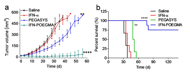 为了解决这些问题,高卫平实验室首次利用定点原位生长技术(SIG)合成干扰素-高分子偶联物(IFN-POEGMA)。该方法大幅度提高了产率,是PEGylation的60倍,能够有效降低生产成本。IFN-POEGMA的药代和生物分布与PEGylatedIFN-α(派罗欣,PEGASYS)的相似,但是其体外生物活性是PEGASYS的7倍。动物实验结果表明,IFN-POEGMA不仅完全抑制了肿瘤的生长,而且治愈了75%的小鼠,而在同样给药剂量下PEGASYS仅能在一定程度上抑制肿瘤生长,但不能治愈小鼠(图2a和2b)。这些实验结果首次表明,通过SIG方法可以高效可控制备出比已在临床广泛使用的一线药物金标准(PEGASYS)更好的新型蛋白药物,具有巨大的临床转化前景和社会经济价值。