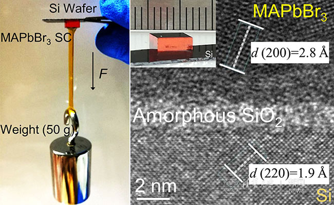 硅晶圆集成的单晶钙钛矿承重测试以及钙钛矿和硅界面处的TEM照片