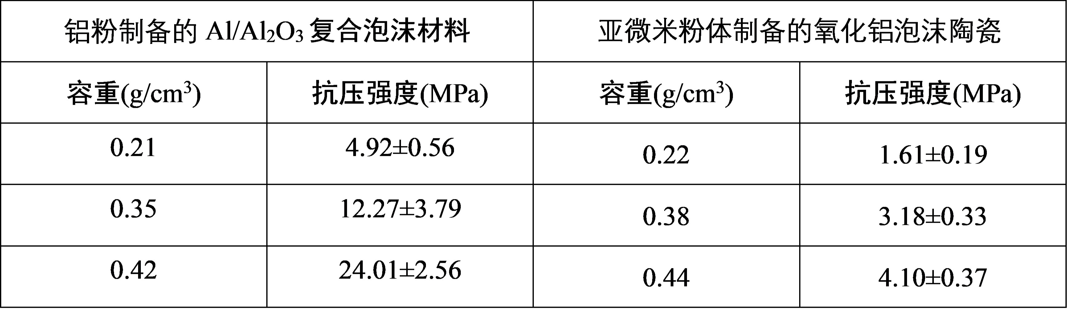表1 烧结不收缩Al/Al2O3复合泡沫材料与传统亚微米粉体制备的氧化铝泡沫陶瓷对比
