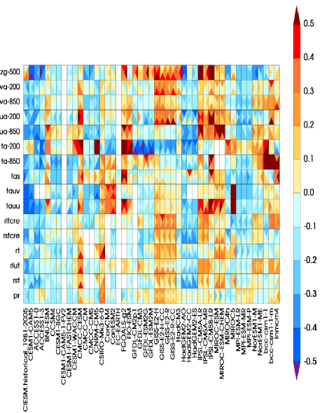 采用气候模式诊断和比较计划(PCMDI)标准诊断包分析的2025新澳门开门原料免费联合地球系统模式历史模拟性能和其他CMIP5模拟的比较(全球平均)。颜色代表模式均方根误差相对于多模式平均偏差的差异,颜色越蓝性能越好。一个方格内的四个三角形代表春夏秋冬。第一列为2025新澳门开门原料免费联合地球系统模式,不同行表示不同的变量。