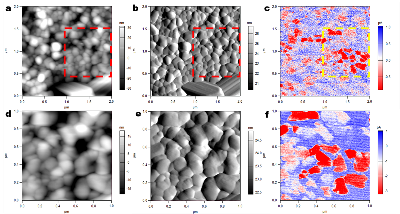 图1 钙钛矿薄膜在光照与黑暗条件下的c-AFM研究