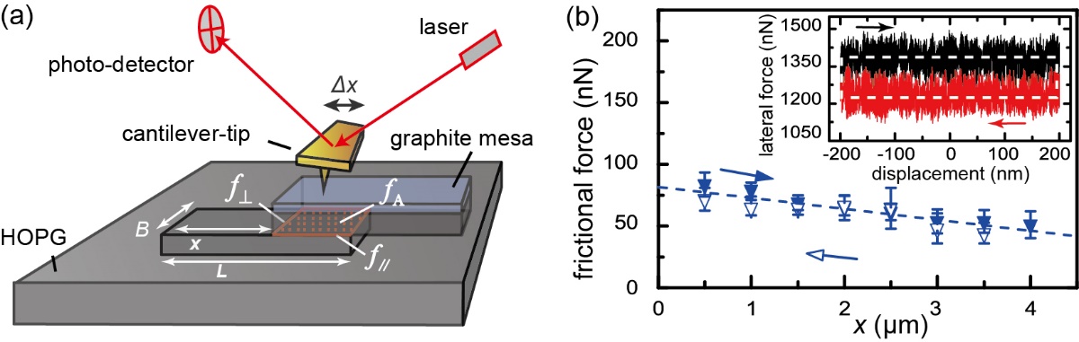 (a)使用原子力显微镜操纵石墨岛,测量石墨超滑接触在不同接触面积与接触周长条件下的摩擦力。(b)摩擦力与X成线性关系,通过其斜率与截距可测出接触面内部与接触边缘各自对摩擦的贡献。
