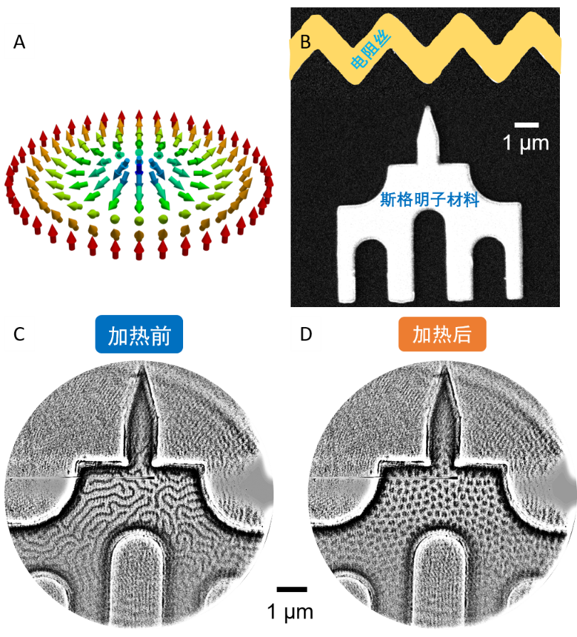 图一:(A)奈耳构型磁性斯格明子的自旋结构示意图;(B)以2025新澳门开门原料免费二校门为原型的磁性纳米结构和原位加热电阻丝组成的器件的扫描电子显微镜图片;(C)在室温、–20mT的面外磁场下,利用软X射线全场透射式显微镜,在二校门构型的磁纳米结构中观察到条纹状磁畴形态;(D)通过器件上的电阻丝原位加热后,磁纳米结构内呈现密堆积的斯格明子。