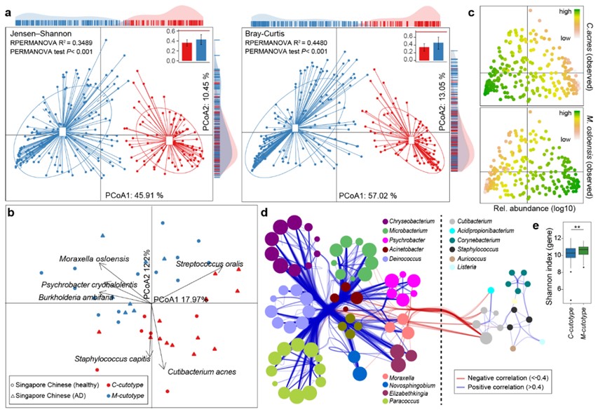 研究团队还发现两类人群的皮肤微生物组均存在极强的个体差异性。面对如此复杂的多样性,若能解析微生物群落组成的结构模式则可大大降低数据的复杂性。群体分型(stratification)已应用于肠道微生物中,被定义为“肠型”(enterotypes),可有效描述肠道微生物群落结构,对指导临床实践产生了积极的影响。在本项研究中,研究者首次报道皮肤微生物在中国人群的群体水平亦存在2种稳定的群落组成模式(命名为“皮肤型”cutotypes),分别是以奥斯陆莫拉菌(Moraxella osloensis)为主导的M型皮肤(M-cutotype)和以痤疮丙酸杆菌(Cutibacterium acnes)为主导的C型皮肤(C-cutotype)。