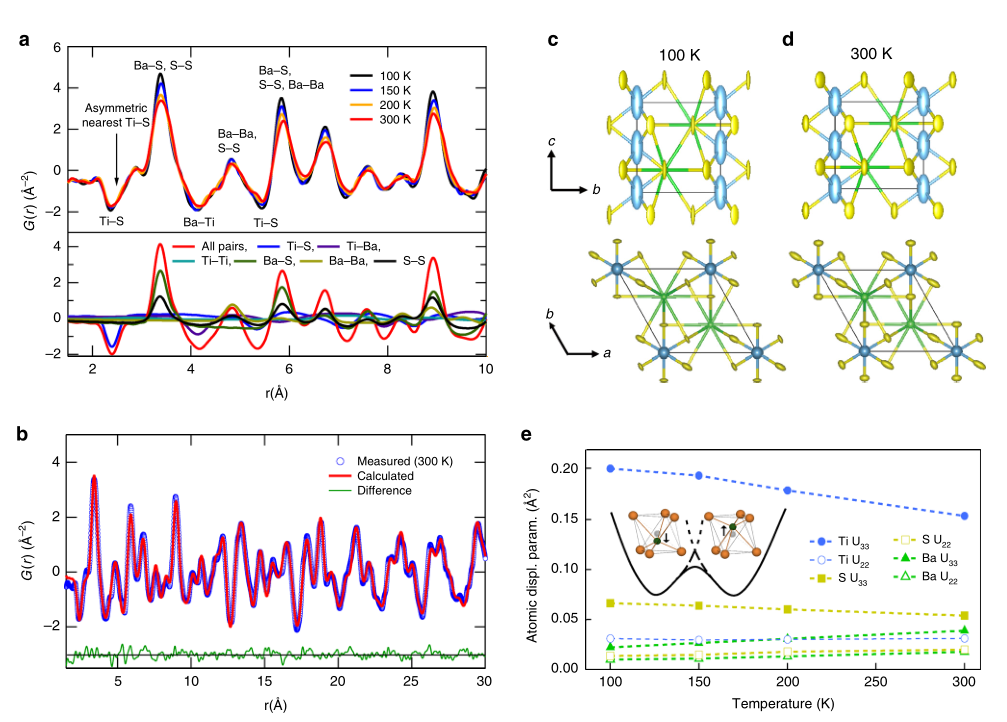 为了进一步确定反常趋势的产生原因,研究者利用中子粉末衍射测量发现Ti-S键与Ba-Ti键随温度变化的反常现象(图2a,2b)。同时,对于Ti原子与S原子的各向异性位移计算发现,随着温度的降低,Ti与S原子沿c轴的位移幅度越来越大(图2c,2d)。据此,研究者提出了浅势阱中钛原子的双峰分布模型,使得计算结果与实验更加吻合(图2e)。