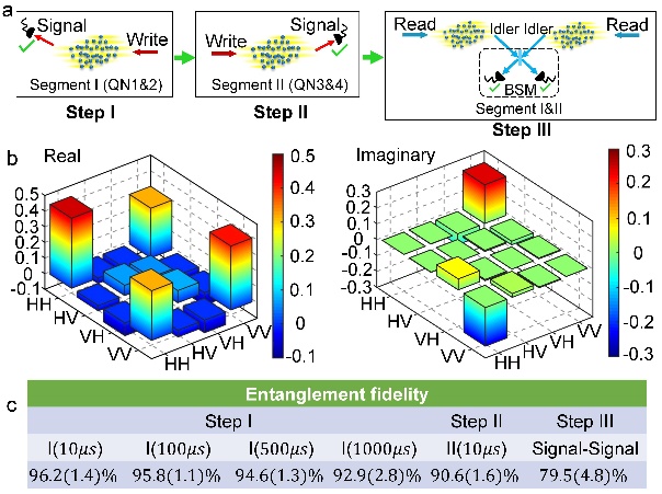 光子在光纤中传播时的指数级衰减是长程量子通讯和大规模量子网络的实现过程中面临的主要问题,而量子中继协议是解决光纤传播损耗的最佳方案。2001年,段路明与合作者提出著名的DLCZ(Duan-Lukin-Cirac-Zoller)量子中继方案,利用原子量子存储器和单光子信道的结合,克服光量子信号在光纤中的指数衰减问题,之后持续成为该领域研究热点。经过世界各国研究团队近20年的努力,DLCZ量子中继协议的实验实现在许多方面已经取得了长足的发展,例如如何在一个小的中继模块中产生量子纠缠的技术已经日趋成熟。但是作为量子中继协议中关键的步骤,即如何将小规模的中继模块通过量子存储器的存储,与邻近的中继模块高效的连接成为一个更大的中继模块从而扩大量子纠缠在空间中的分布,因为实验技术方面存在的困难,一直尚未实现。