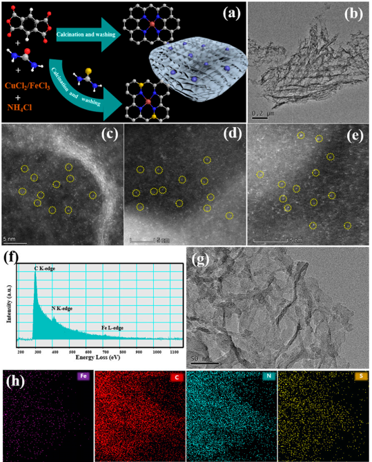 图2. Cu/Fe单原子同步辐射结果和配位结构模型