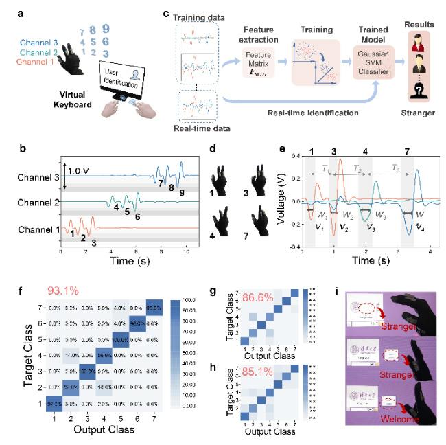 清华新闻网11月3日电 人机交互领域的发展对人性化、沉浸式的人机界面(HMIs)提出了更高的要求。新型人机交互界面不仅需要简洁、高效的设计,更要求直观的操作方式和符合人类直觉的操作体验。在智能家居、辅助技术和智能安保等方面,直观且多功能的人机交互方式显得意义重大。手势作为可传达丰富意图的肢体语言,在人机交互中颇受青睐,基于手套的人机交互界面也被相继报道。而部分工作局限在提取手势的有限信息,不仅不利于开发多维人机交互,还会增加交互系统的复杂度,造成系统能耗和计算压力的升高,并降低用户的操作体验。另一方面,手势中包含的多维特征亟待提取利用,以开发结构简洁且功能多样的人机交互界面。
