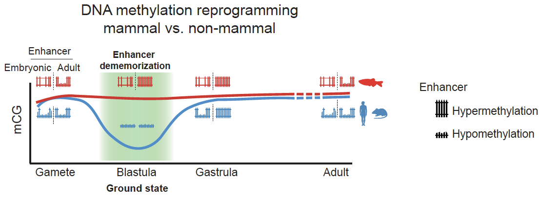 基于上述研究结果,研究人员提出一个模型来解释哺乳动物和其他的脊椎动物为什么采用了不同的DNA甲基化重编程模式。哺乳动物和非哺乳动物可能都是通过改变DNA甲基化水平去除亲本记忆。哺乳动物通过大规模擦除基因组DNA甲基化去除亲本记忆,而斑马鱼等非哺乳动物则通过甲基化增强子区域来去除亲本记忆,最终都达到了重置发育时钟的目的。这项工作不仅回答了斑马鱼早期胚胎发育中DNA甲基化的调控作用,同时加深了我们对于细胞重编程以及全能性获取的理解。